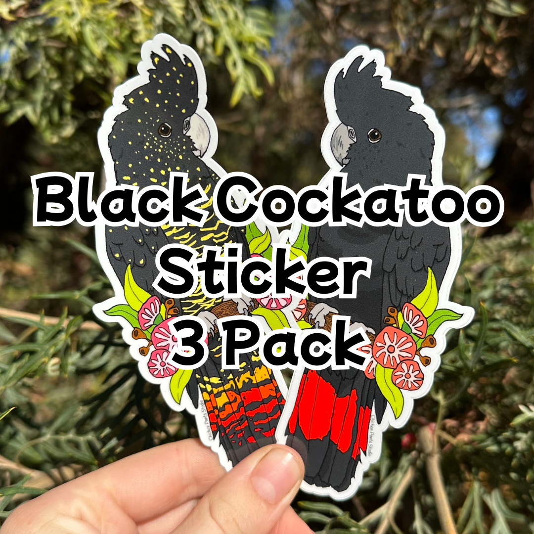 This bundle of 3 black cockatoo stickers includes our Female and Male Red-Tailed Black Cockatoos and Carnaby's Black Cockatoo stickers, the perfect set for your car, water bottle or laptop.